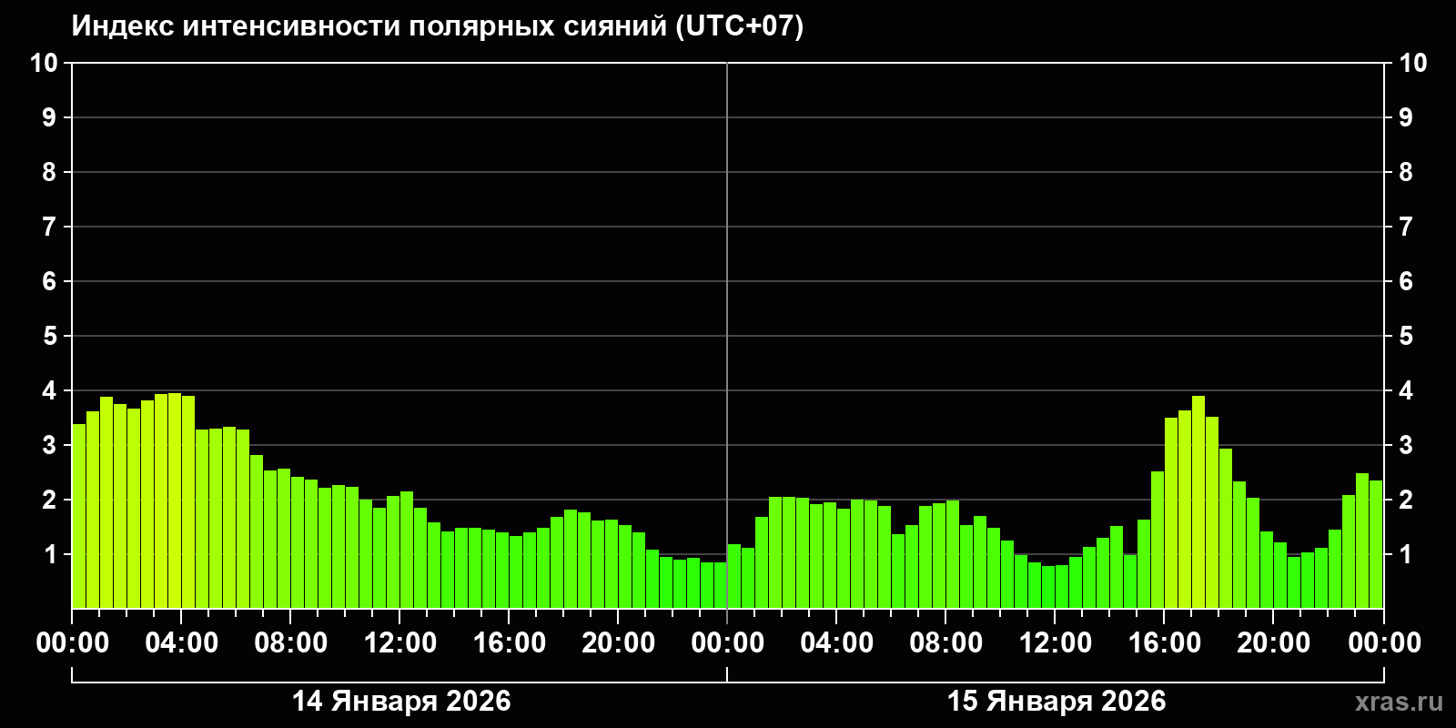 Изменения индекса интенсивности полярных сияний с 2026-01-14 по 2026-01-15 по местному времени