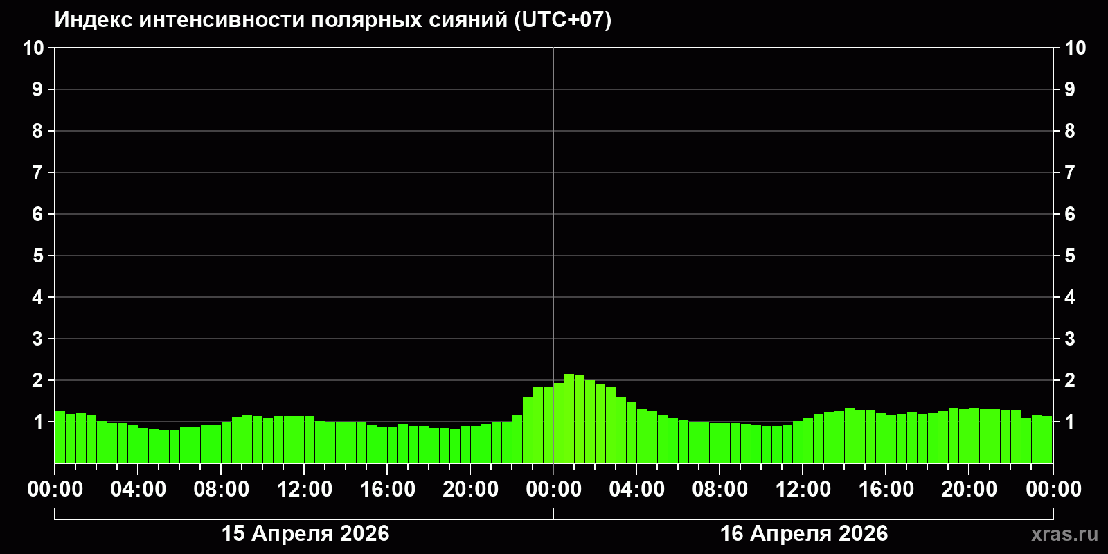 Изменения индекса интенсивности полярных сияний с 2026-04-15 по 2026-04-16 по местному времени
