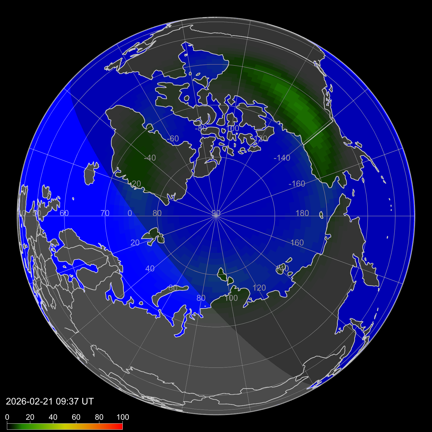 Индекс интенсивности полярных сияний и теоретически возможная широта наблюдений для ночного времени в западном полушарии