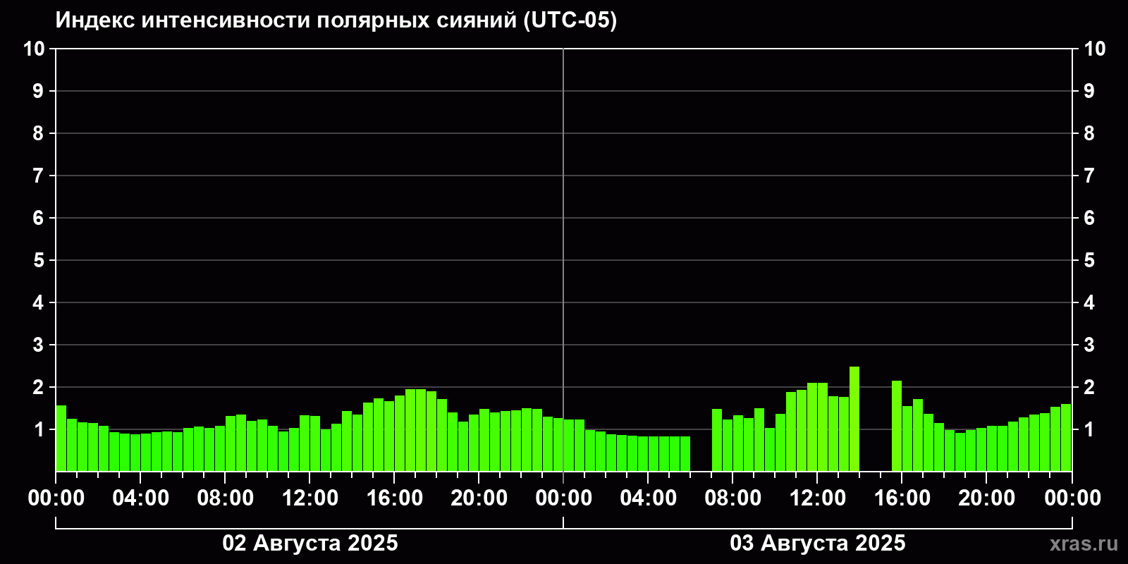 Изменения индекса интенсивности полярных сияний с 2025-08-02 по 2025-08-03 по местному времени