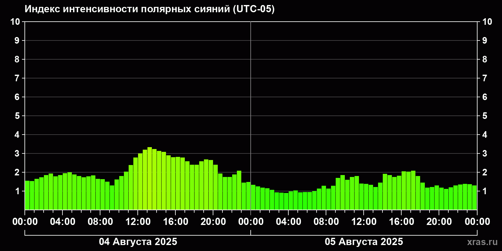 Изменения индекса интенсивности полярных сияний с 2025-08-04 по 2025-08-05 по местному времени