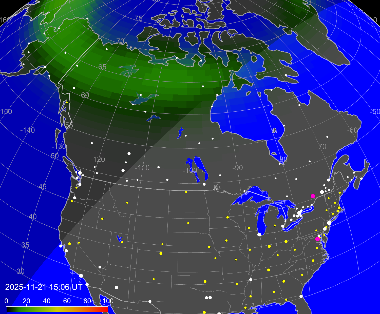 Вероятность полярных сияний в городах Канады