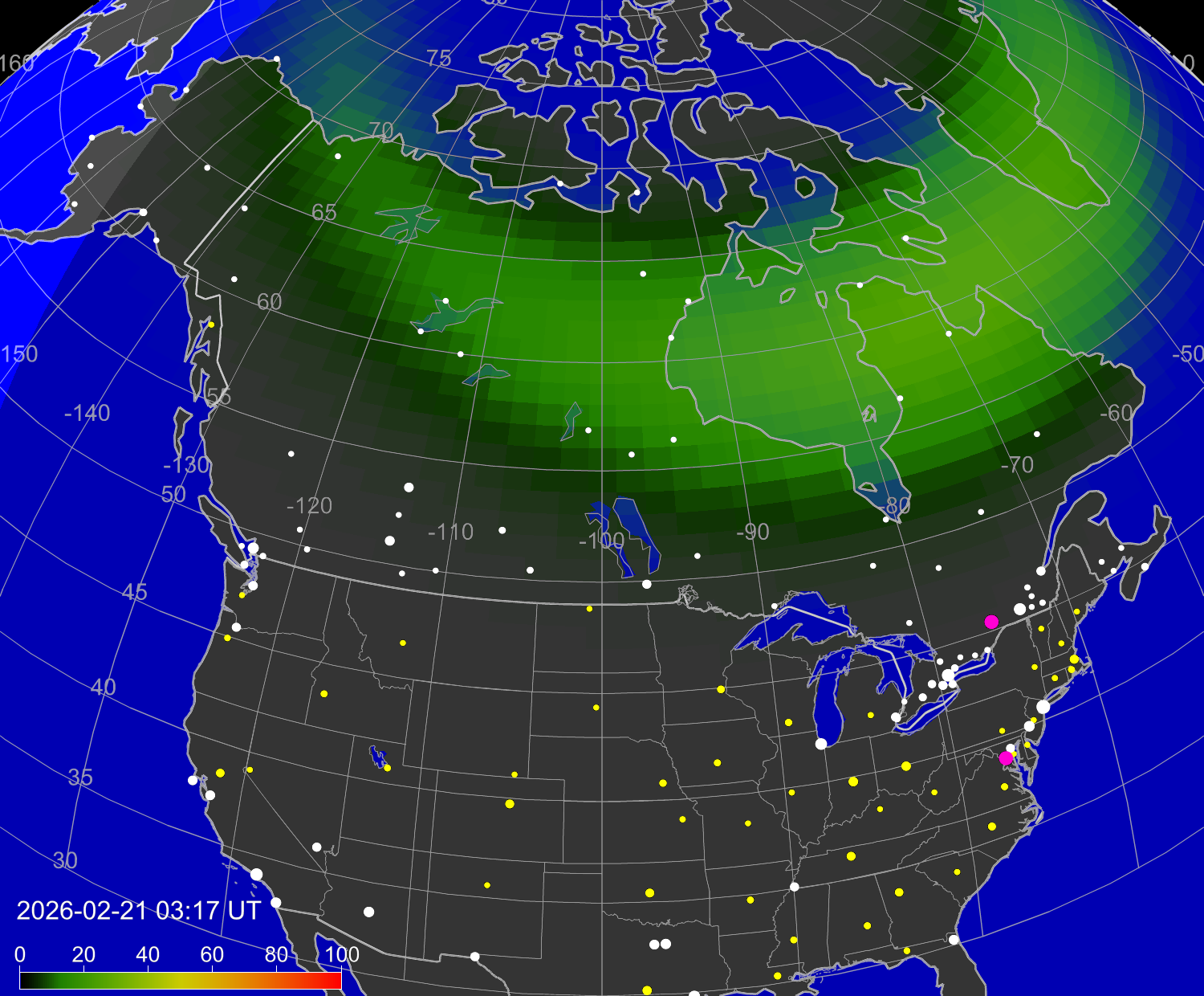 Изменения и часовой прогноз индекса интенсивности полярных сияний с 2026-02-18 по 2026-02-19