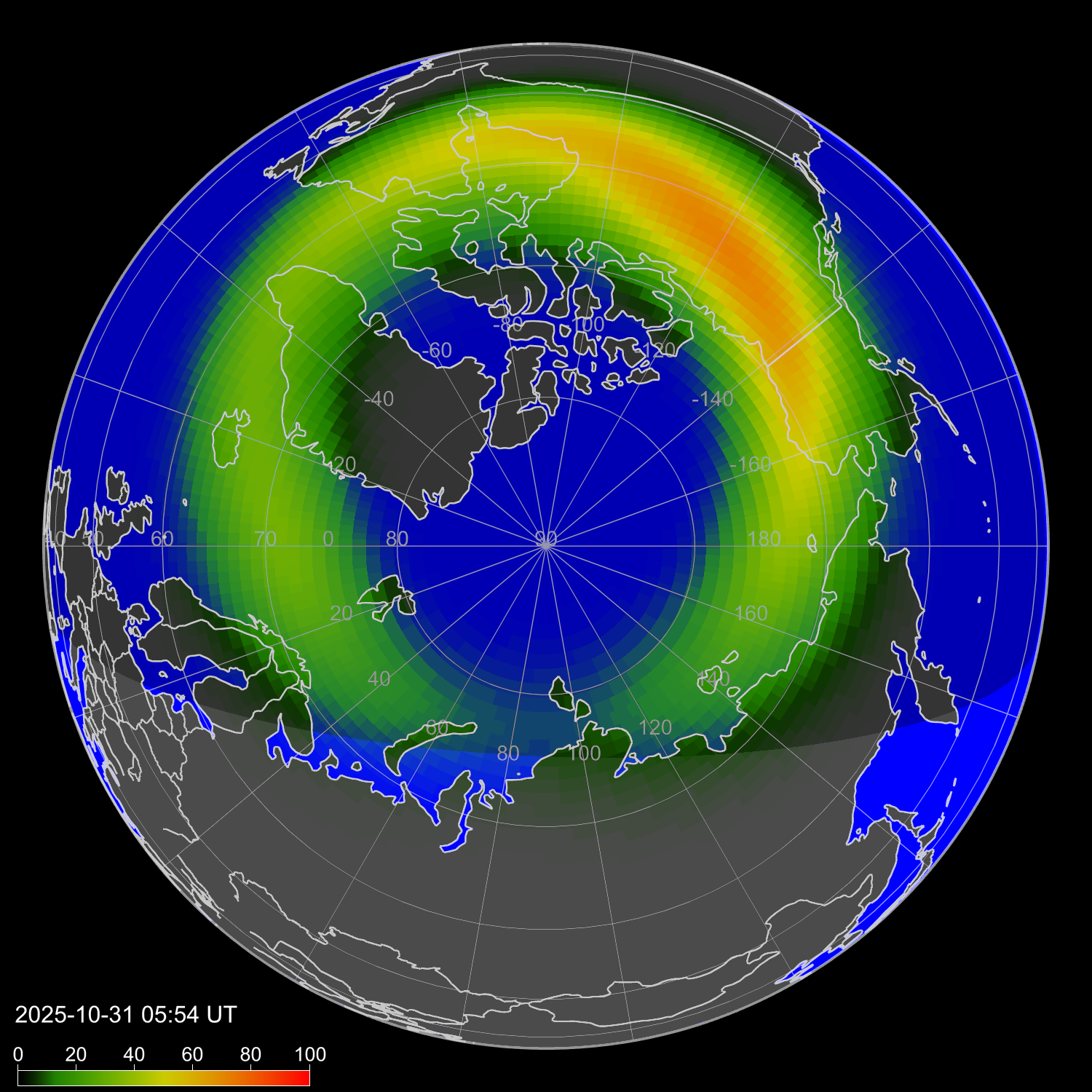 Изменения и часовой прогноз индекса интенсивности полярных сияний с 2025-10-30 по 2025-10-31