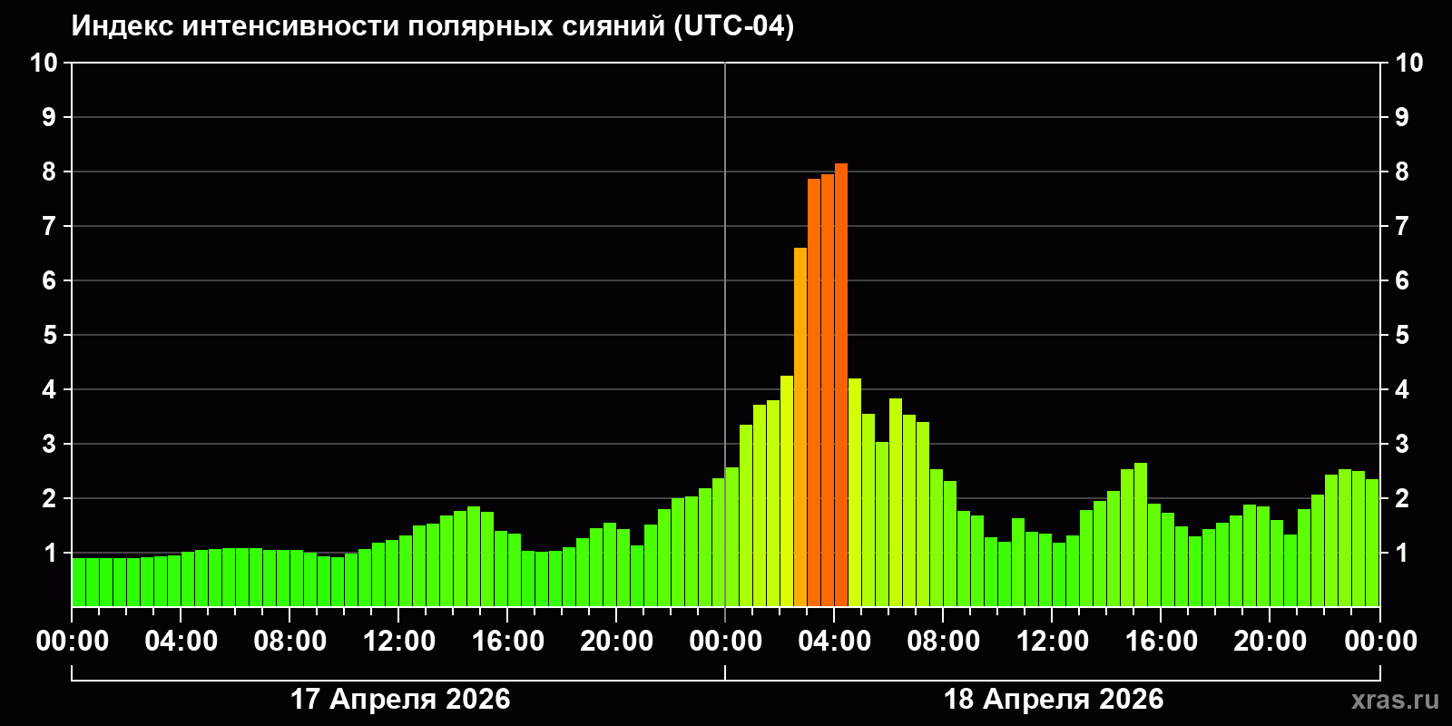 Изменения индекса интенсивности полярных сияний с 2026-04-17 по 2026-04-18 по местному времени