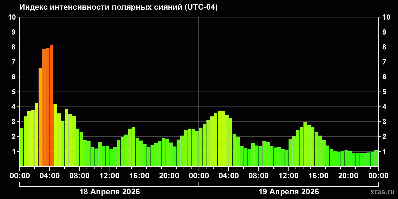 Изменения индекса интенсивности полярных сияний с 2026-04-18 по 2026-04-19 по местному времени