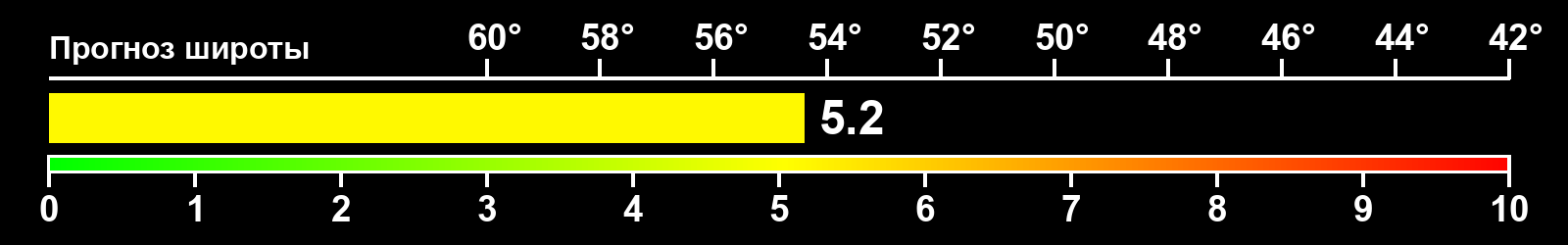 Индекс интенсивности полярных сияний и теоретически возможная широта наблюдений для ночного времени в западном полушарии по состоянию на 2026-01-04 23:55 (конец дня) по местному времени
