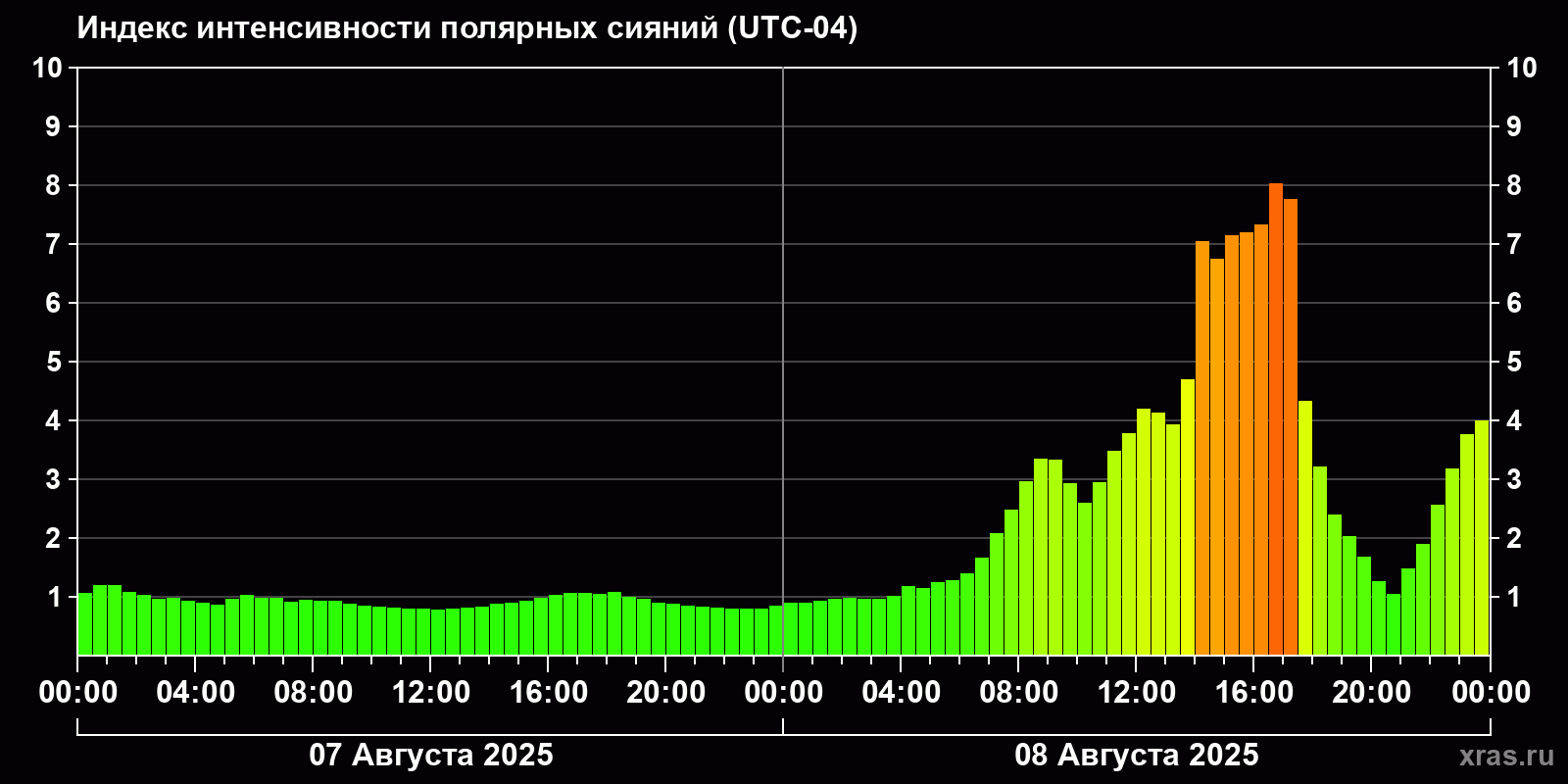 Изменения индекса интенсивности полярных сияний с 2025-08-07 по 2025-08-08 по местному времени