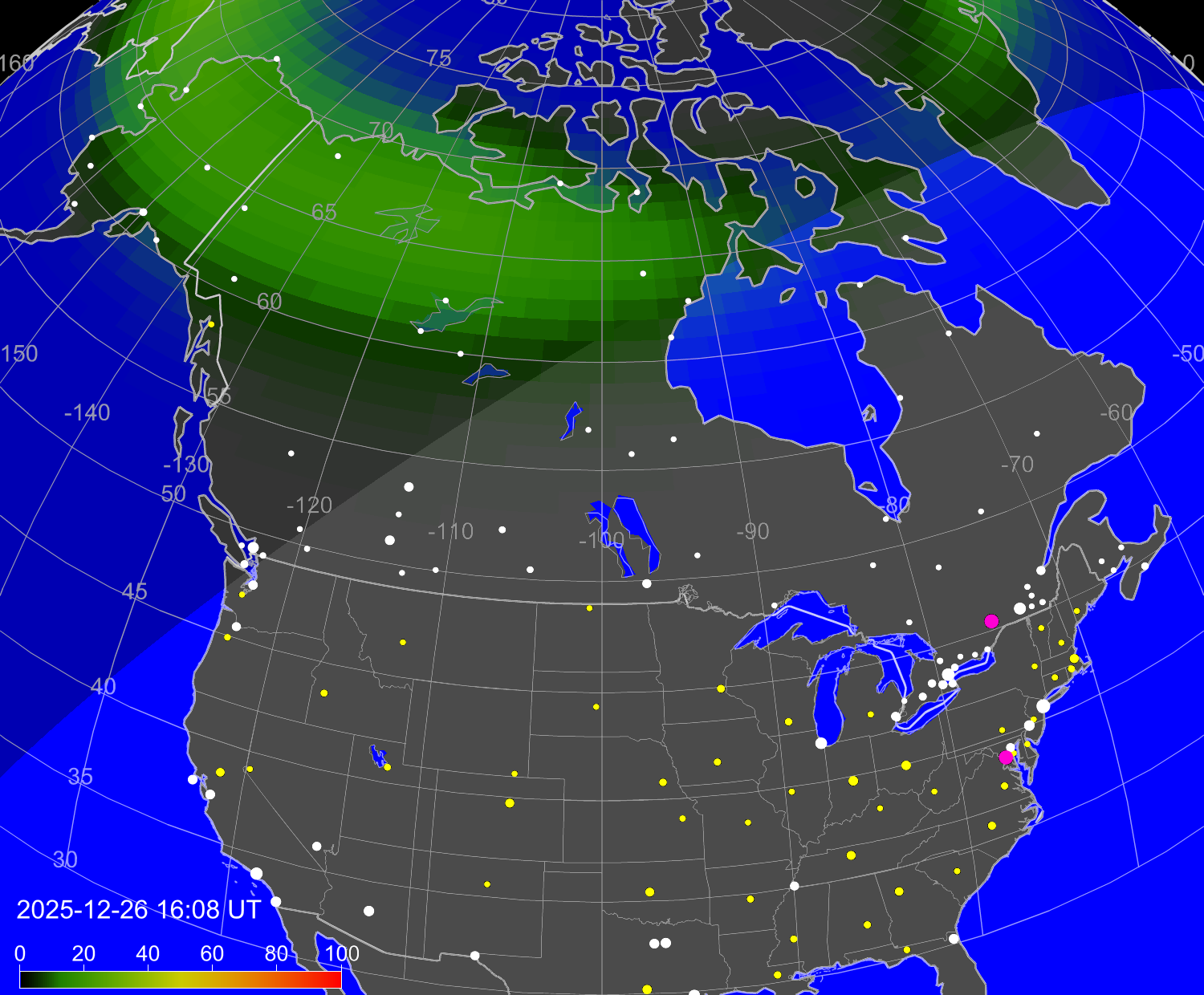 Индекс интенсивности полярных сияний и теоретически возможная широта наблюдений для ночного времени в западном полушарии