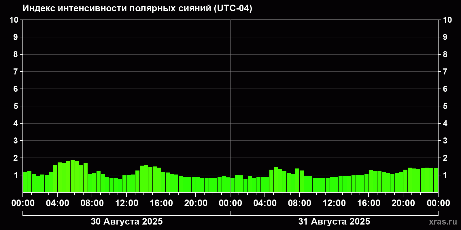 Изменения индекса интенсивности полярных сияний с 2025-08-30 по 2025-08-31 по местному времени