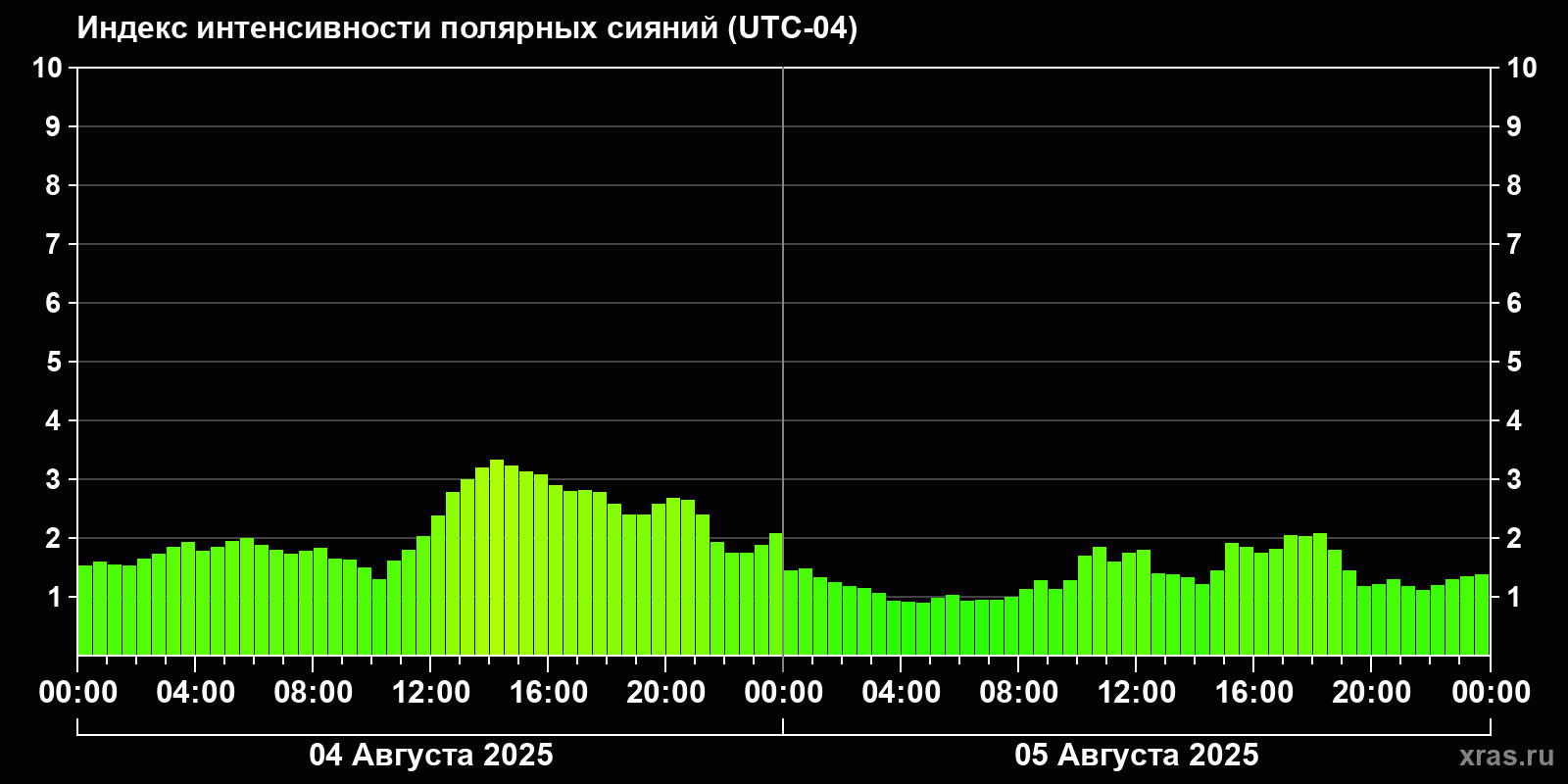 Изменения индекса интенсивности полярных сияний с 2025-08-04 по 2025-08-05 по местному времени