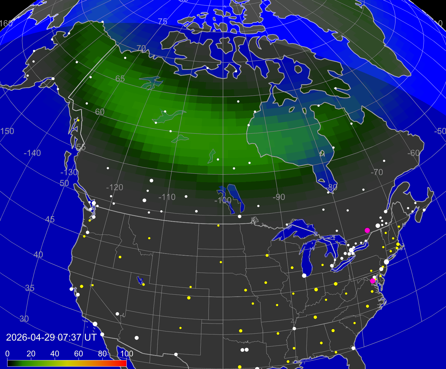 Вероятность полярных сияний в городах Канады