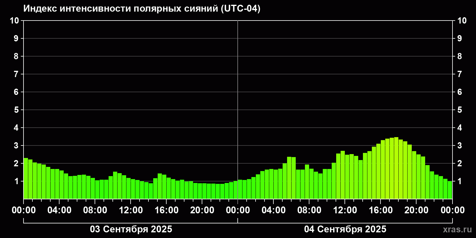 Изменения индекса интенсивности полярных сияний с 2025-09-03 по 2025-09-04 по местному времени