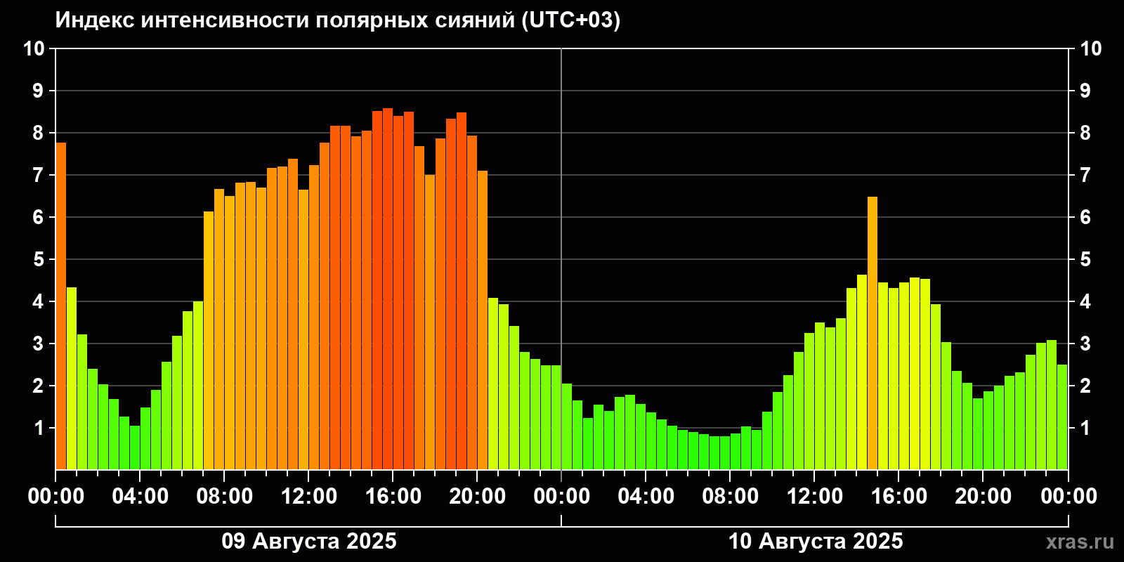 Изменения индекса интенсивности полярных сияний с 2025-08-09 по 2025-08-10 по местному времени