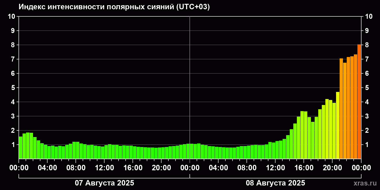 Изменения индекса интенсивности полярных сияний с 2025-08-07 по 2025-08-08 по местному времени