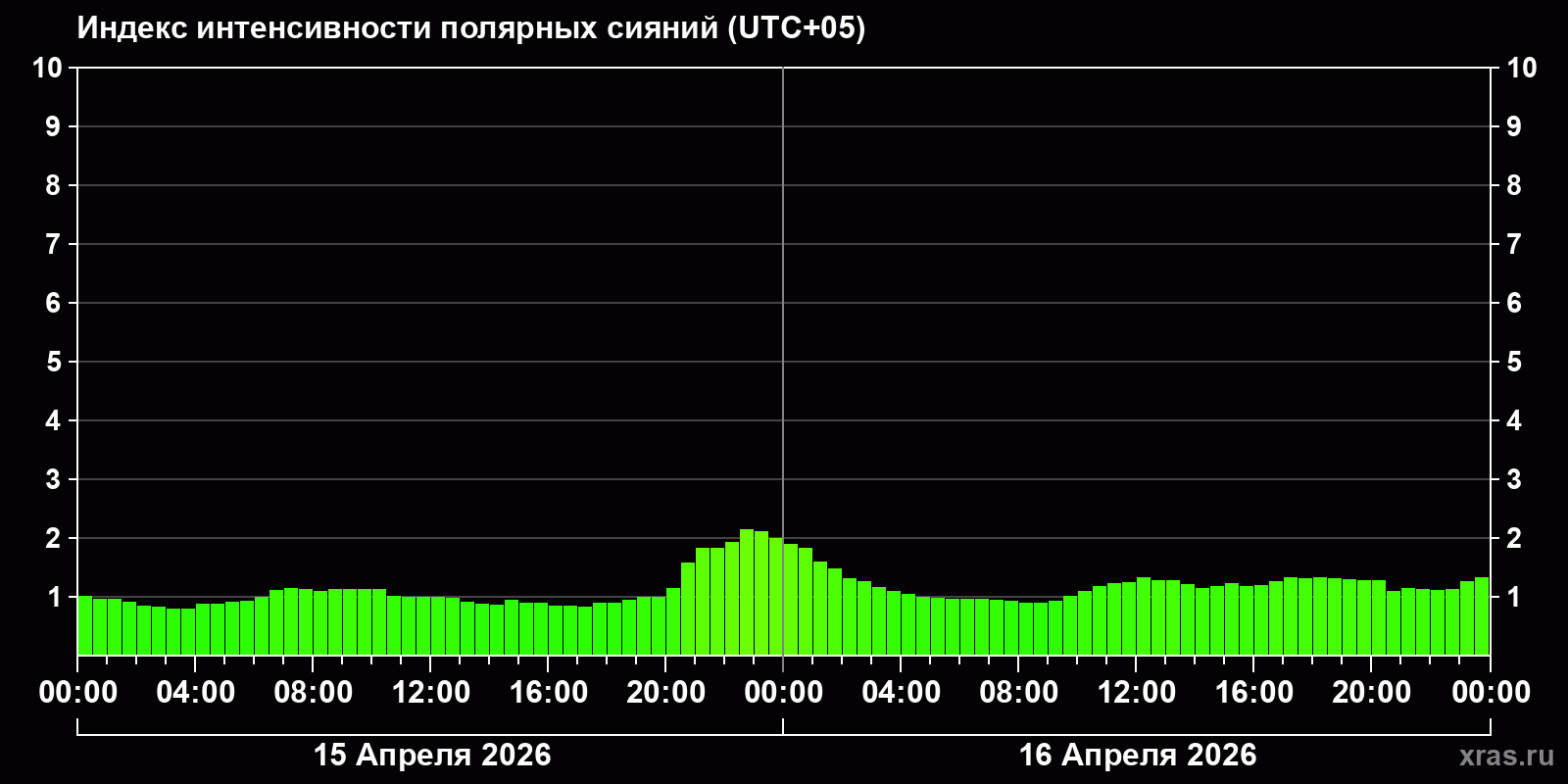Изменения индекса интенсивности полярных сияний с 2026-04-15 по 2026-04-16 по местному времени