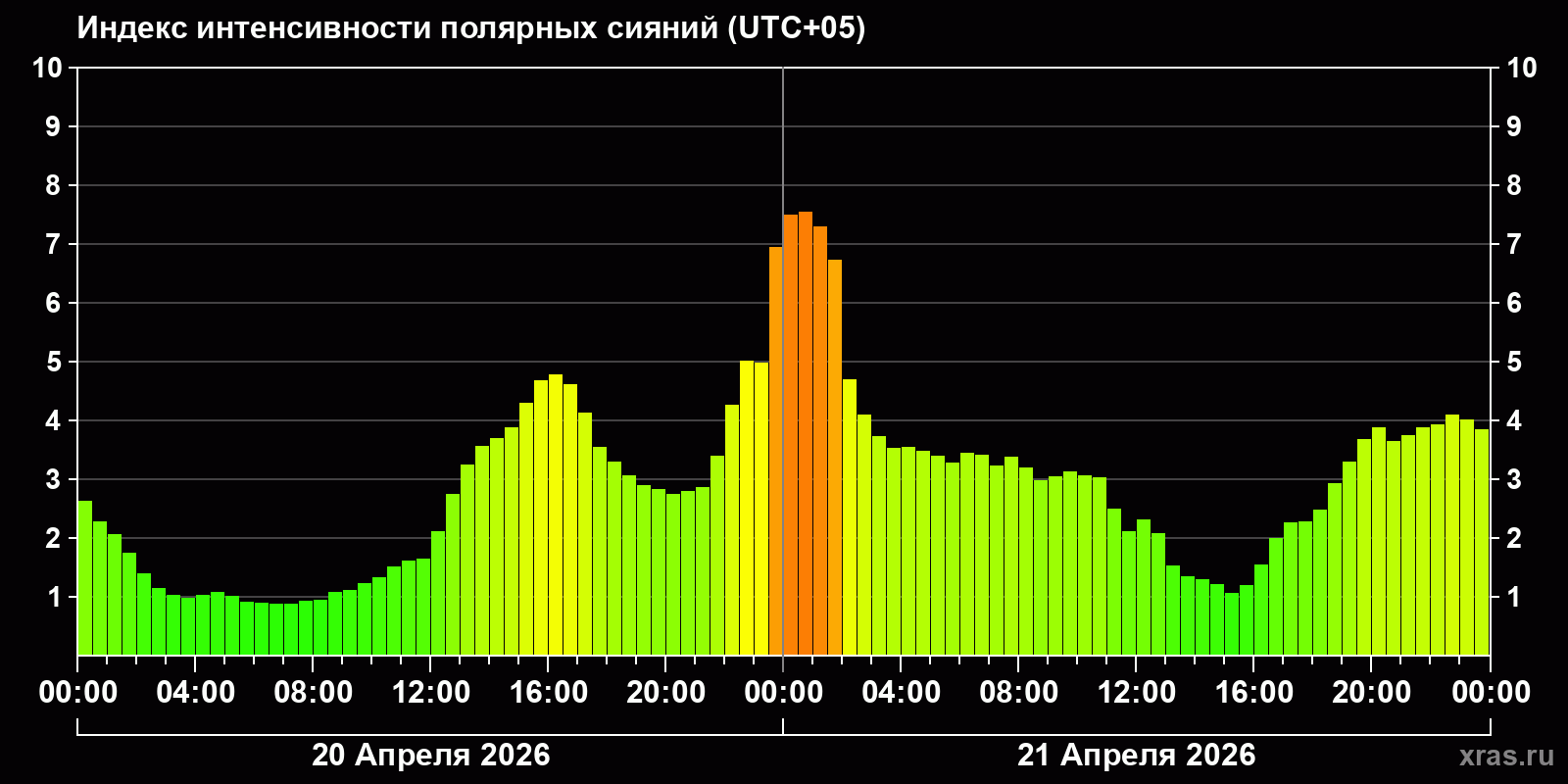 Изменения индекса интенсивности полярных сияний с 2026-04-20 по 2026-04-21 по местному времени