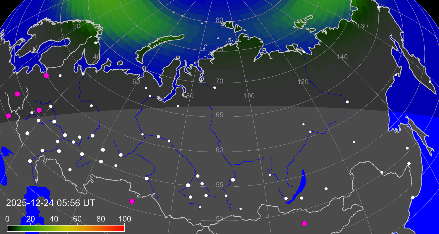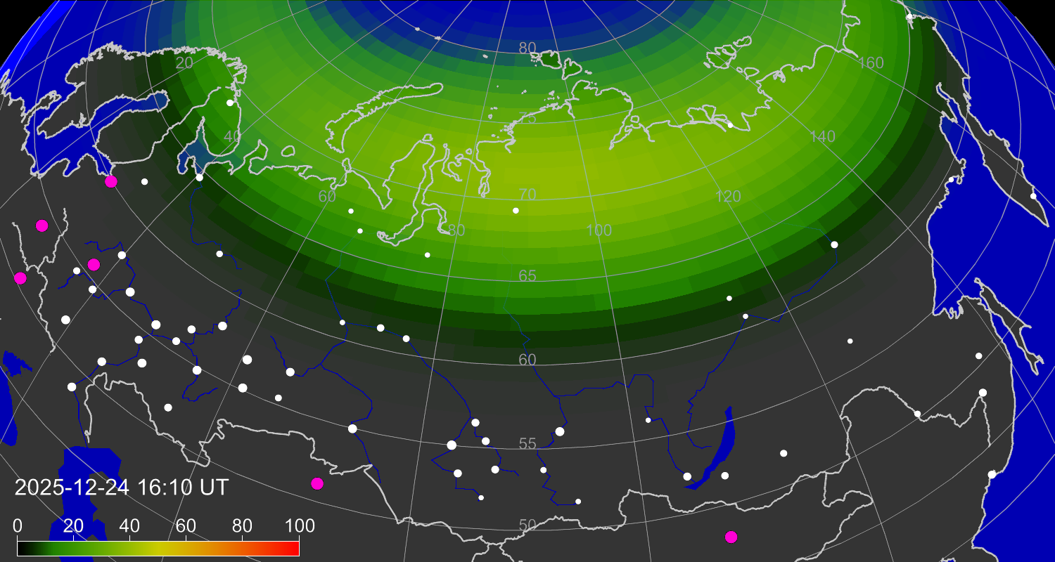 Индекс интенсивности полярных сияний и теоретически возможная широта наблюдений для ночного времени в восточном полушарии