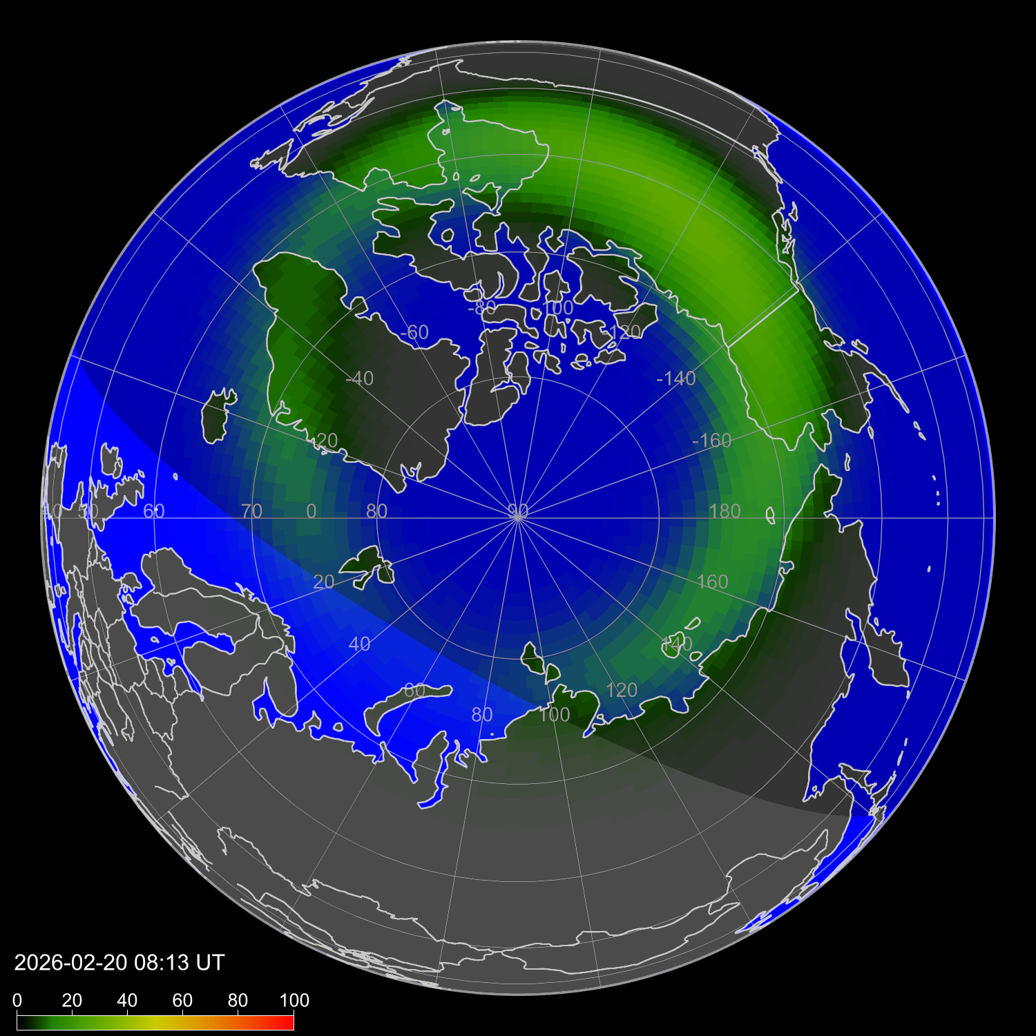 Изменения и часовой прогноз индекса интенсивности полярных сияний с 2026-02-19 по 2026-02-20