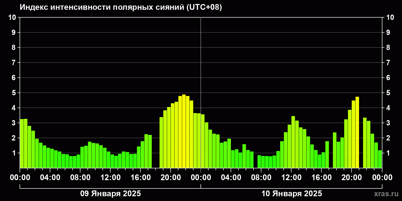 Изменения индекса интенсивности полярных сияний с 2025-01-09 по 2025-01-10 по местному времени