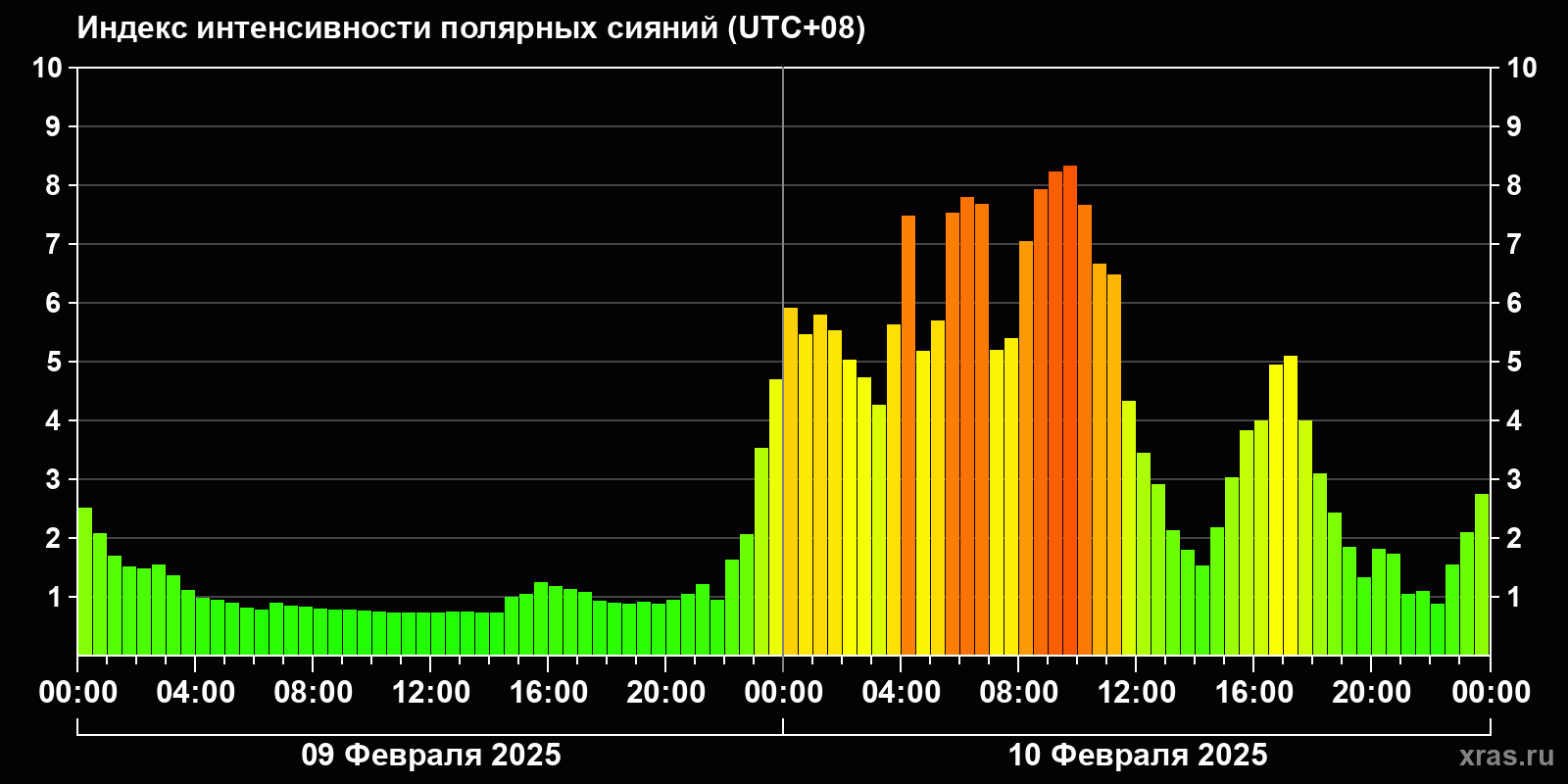 Изменения индекса интенсивности полярных сияний с 2025-02-09 по 2025-02-10 по местному времени