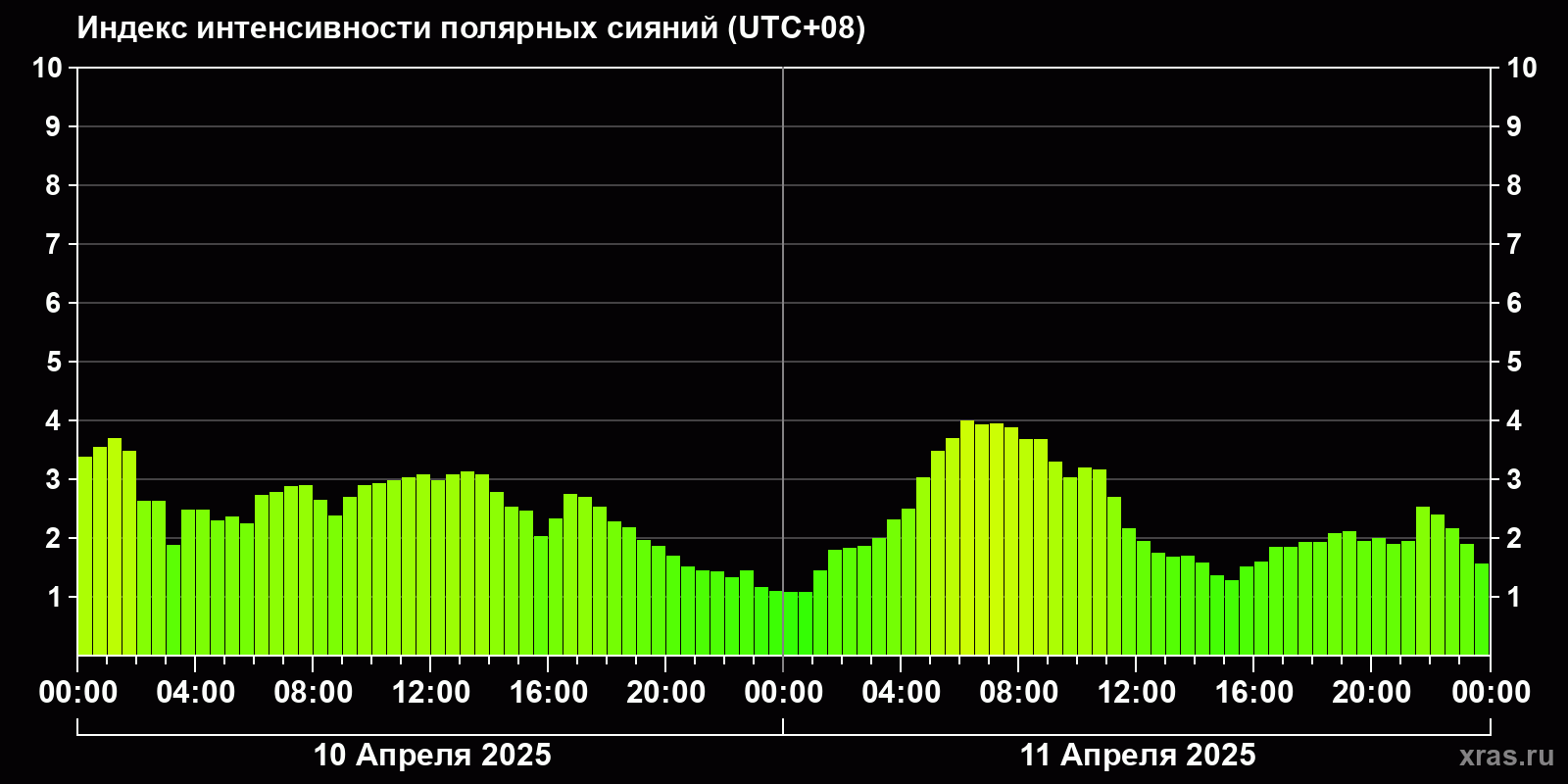 Изменения индекса интенсивности полярных сияний с 2025-04-10 по 2025-04-11 по местному времени