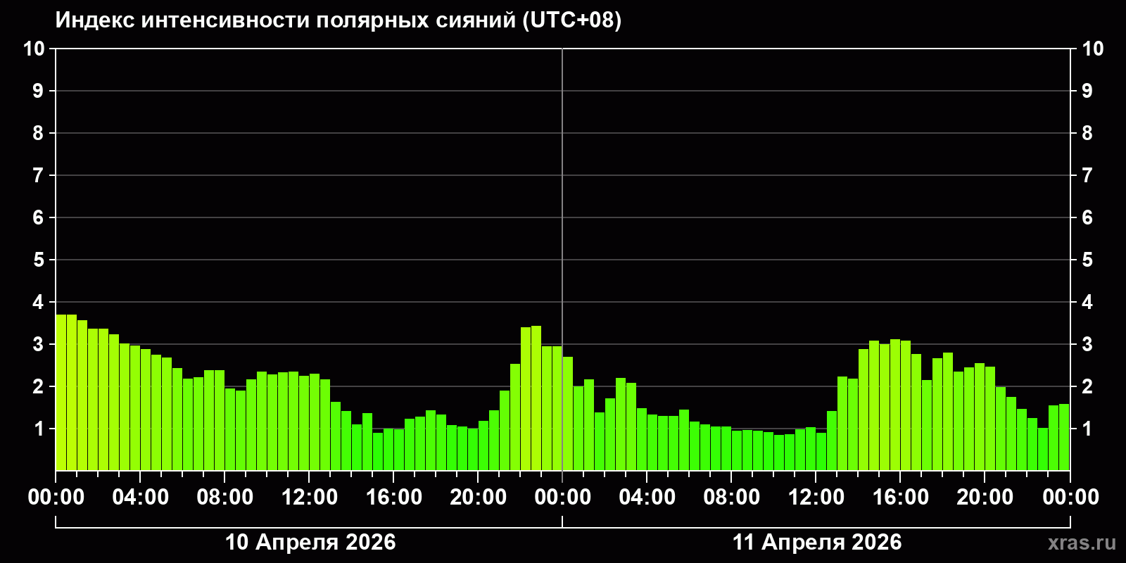 Изменения индекса интенсивности полярных сияний с 2026-04-10 по 2026-04-11 по местному времени