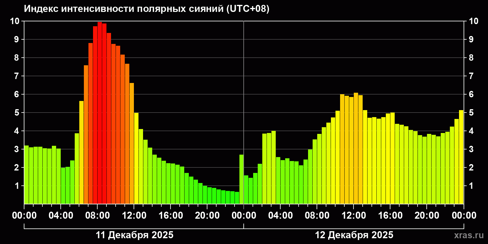 Изменения индекса интенсивности полярных сияний с 2025-12-11 по 2025-12-12 по местному времени