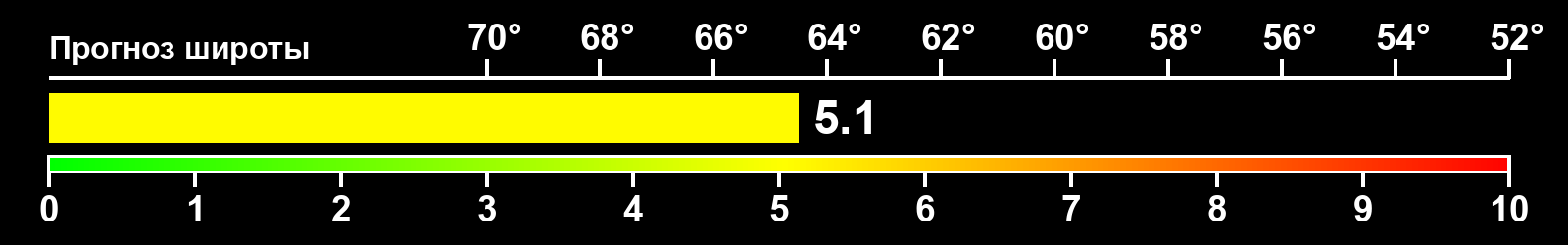 Индекс интенсивности полярных сияний и теоретически возможная широта наблюдений для ночного времени в восточном полушарии по состоянию на 2025-12-12 23:54 (конец дня) по местному времени
