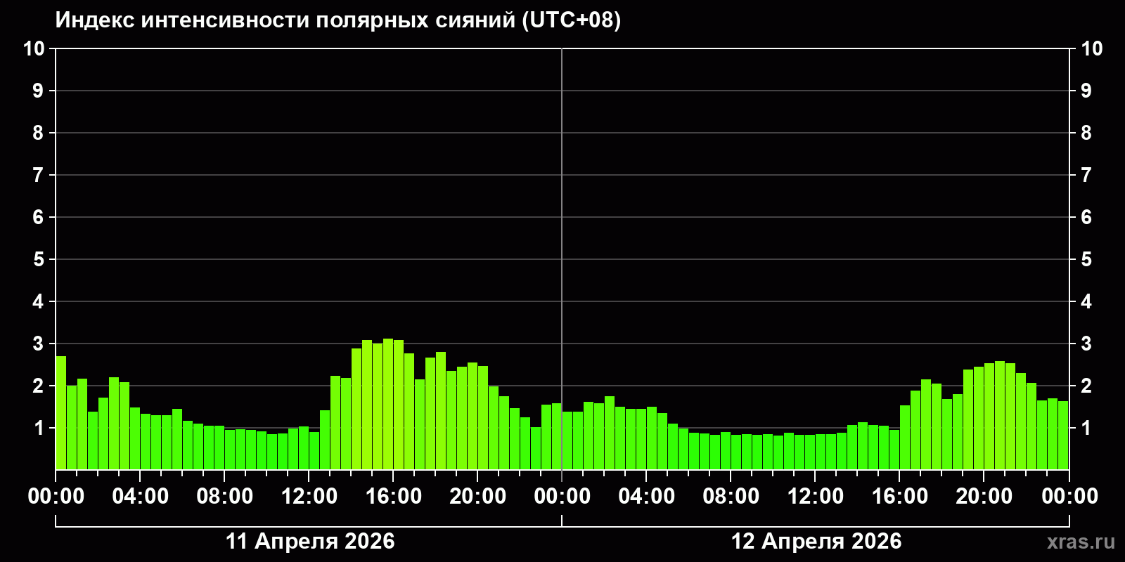 Изменения индекса интенсивности полярных сияний с 2026-04-11 по 2026-04-12 по местному времени