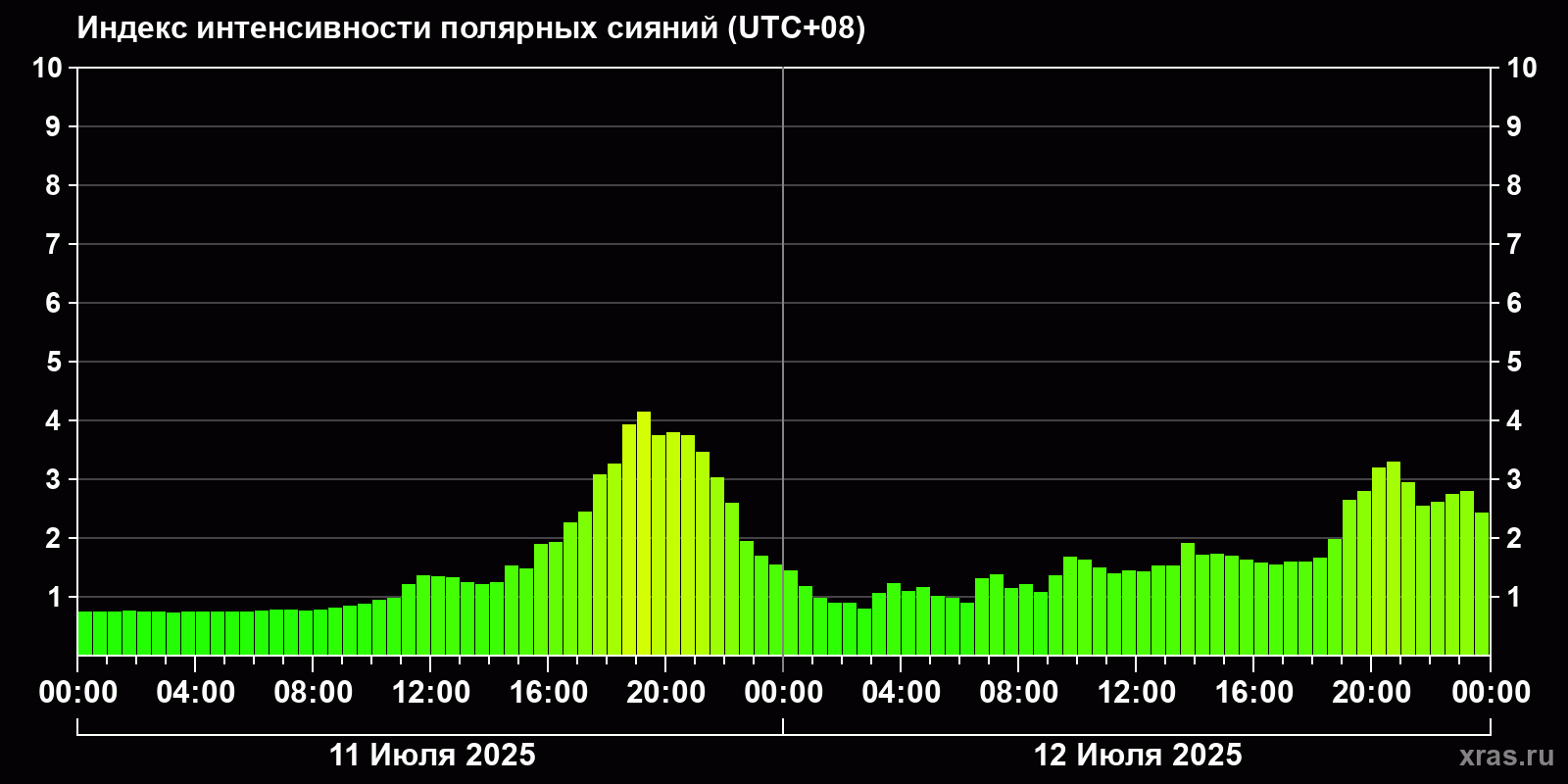 Изменения индекса интенсивности полярных сияний с 2025-07-11 по 2025-07-12 по местному времени