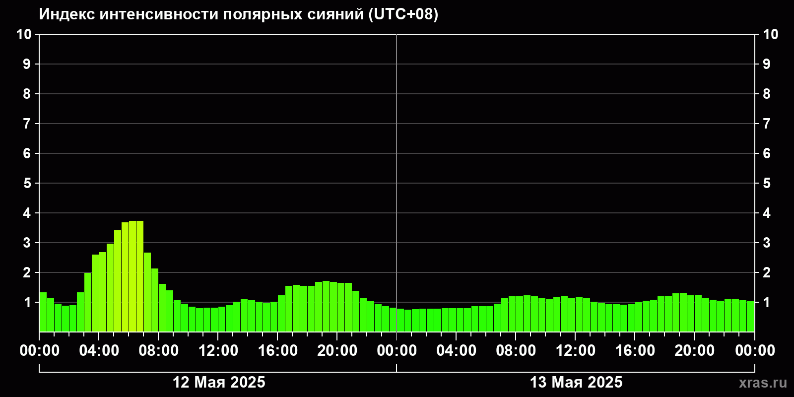 Изменения индекса интенсивности полярных сияний с 2025-05-12 по 2025-05-13 по местному времени