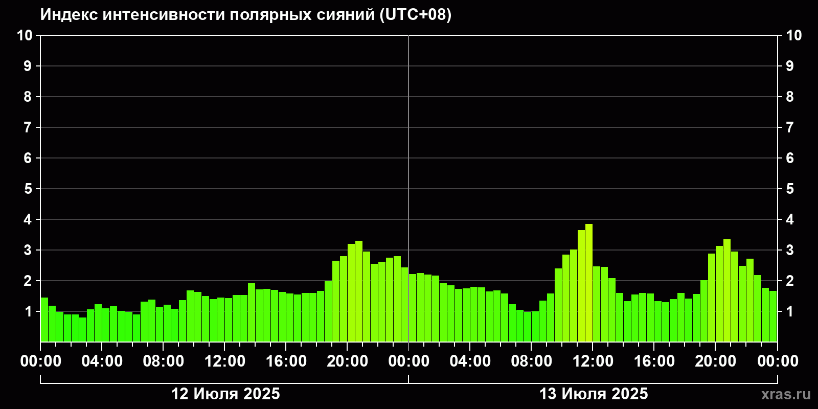 Изменения индекса интенсивности полярных сияний с 2025-07-12 по 2025-07-13 по местному времени