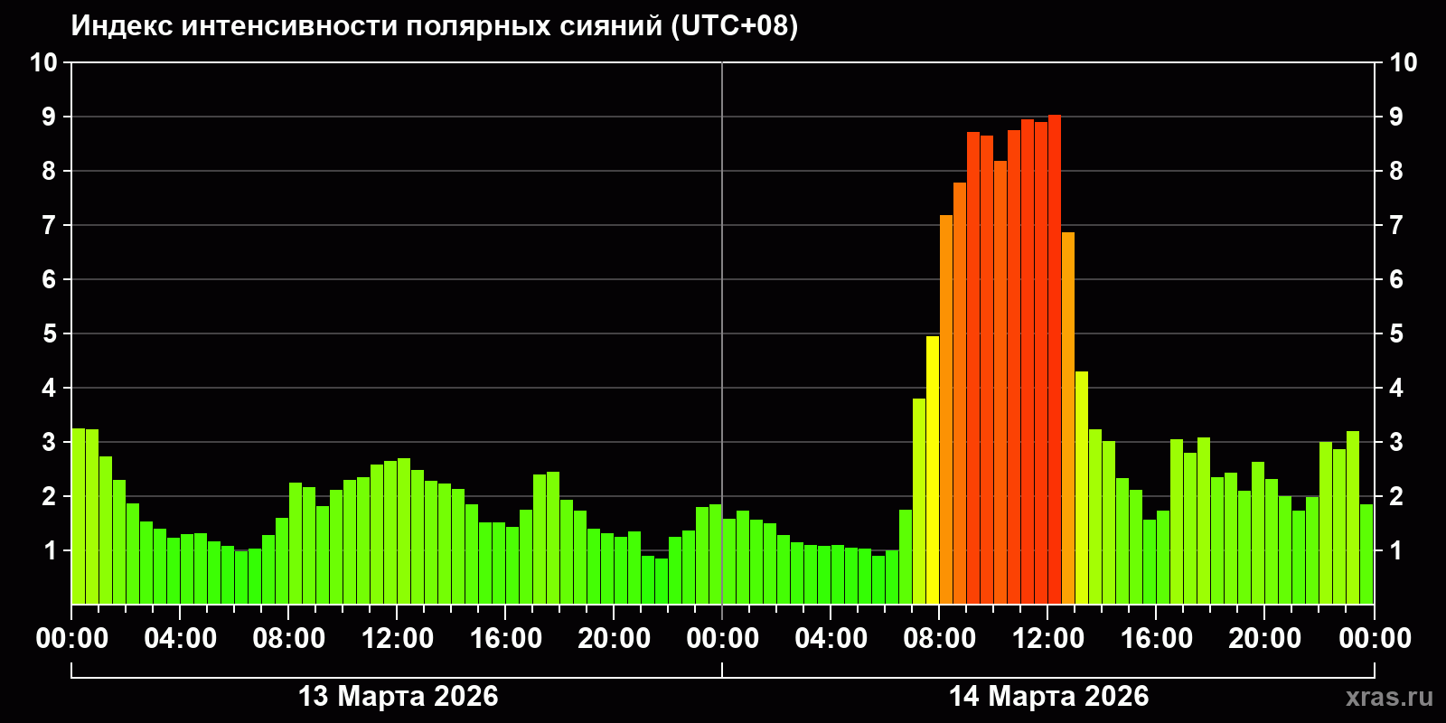 Изменения индекса интенсивности полярных сияний с 2026-03-13 по 2026-03-14 по местному времени