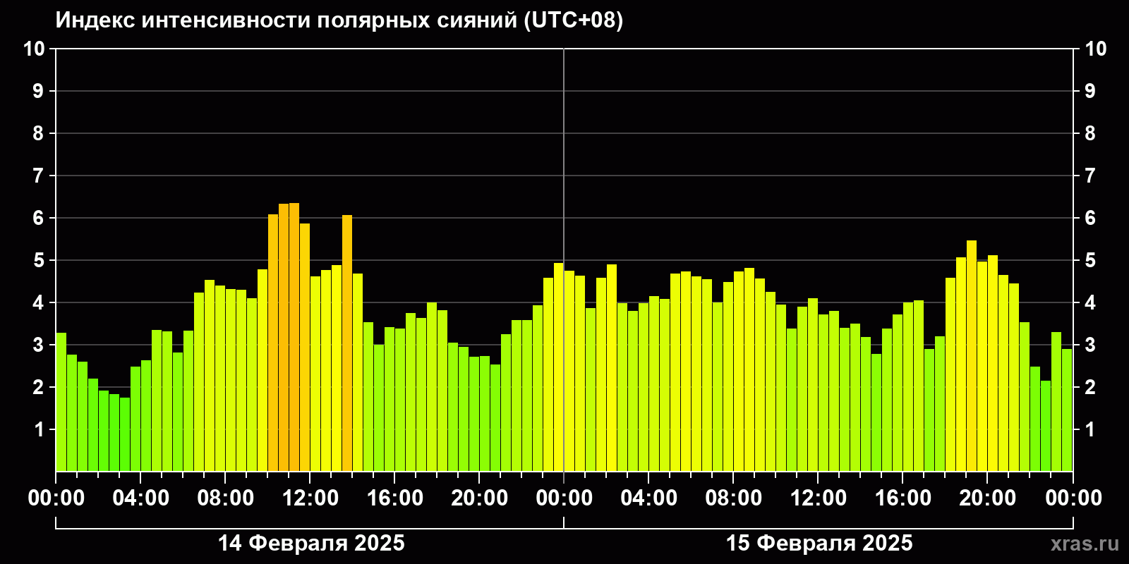 Изменения индекса интенсивности полярных сияний с 2025-02-14 по 2025-02-15 по местному времени