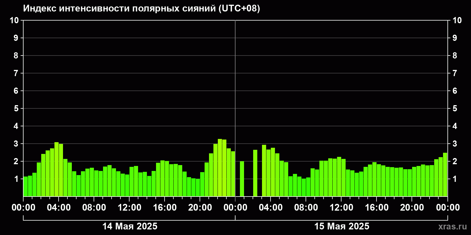 Изменения индекса интенсивности полярных сияний с 2025-05-14 по 2025-05-15 по местному времени