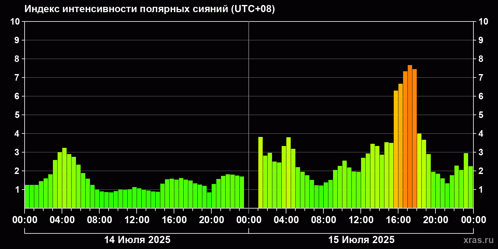 Изменения индекса интенсивности полярных сияний с 2025-07-14 по 2025-07-15 по местному времени