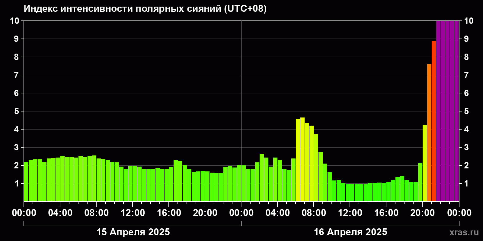 Изменения индекса интенсивности полярных сияний с 2025-04-15 по 2025-04-16 по местному времени