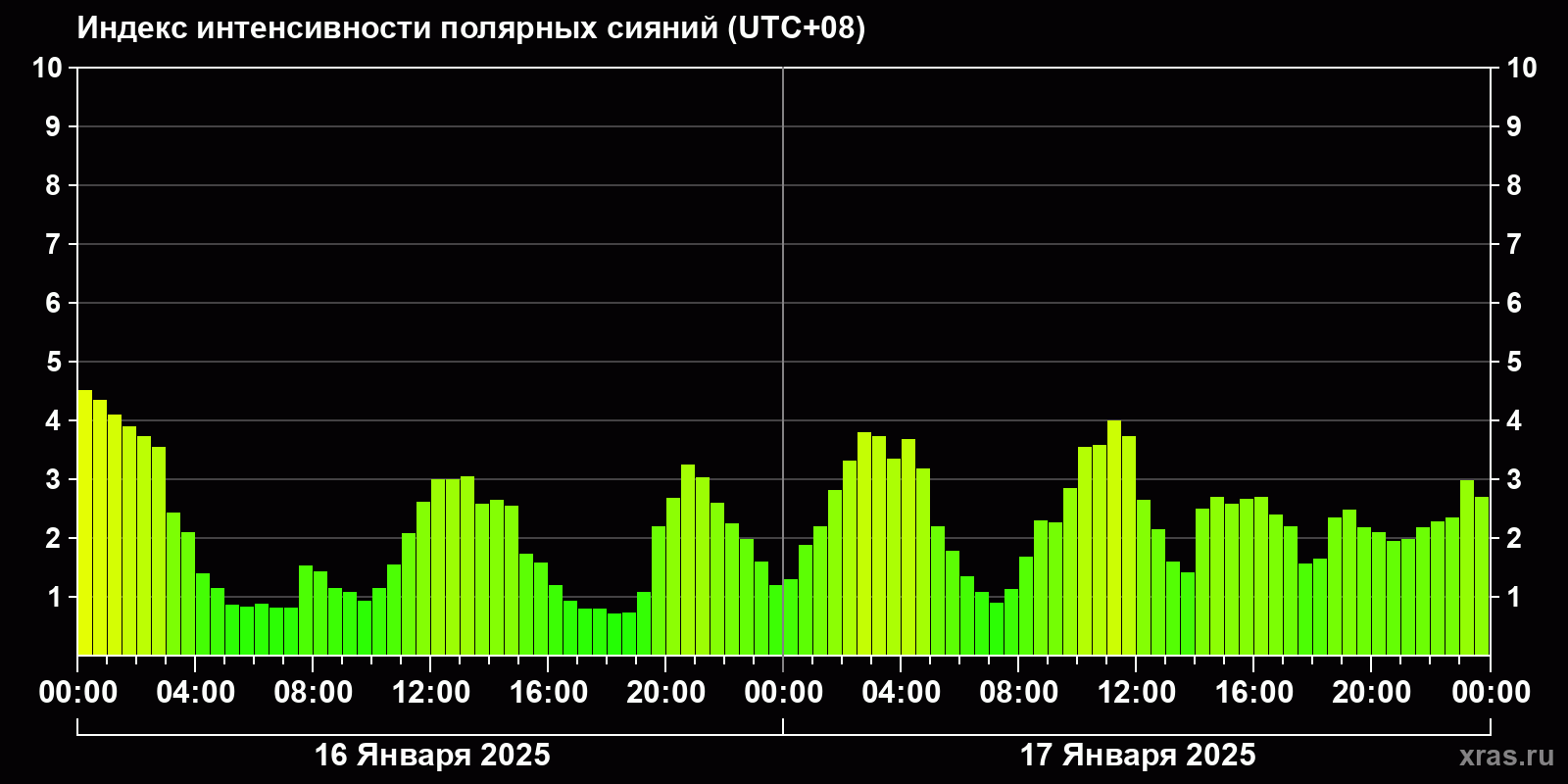 Изменения индекса интенсивности полярных сияний с 2025-01-16 по 2025-01-17 по местному времени
