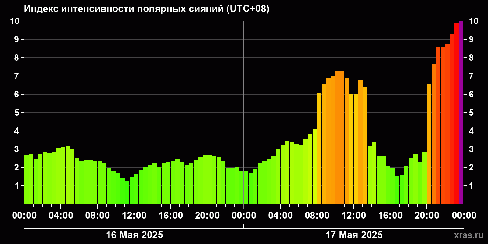 Изменения индекса интенсивности полярных сияний с 2025-05-16 по 2025-05-17 по местному времени