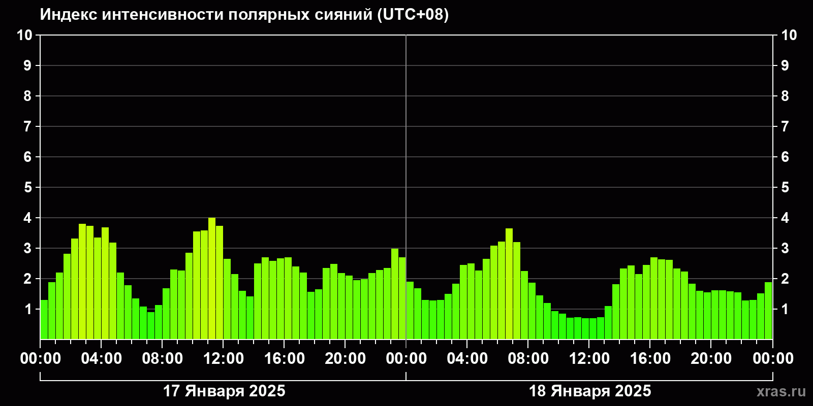 Изменения индекса интенсивности полярных сияний с 2025-01-17 по 2025-01-18 по местному времени