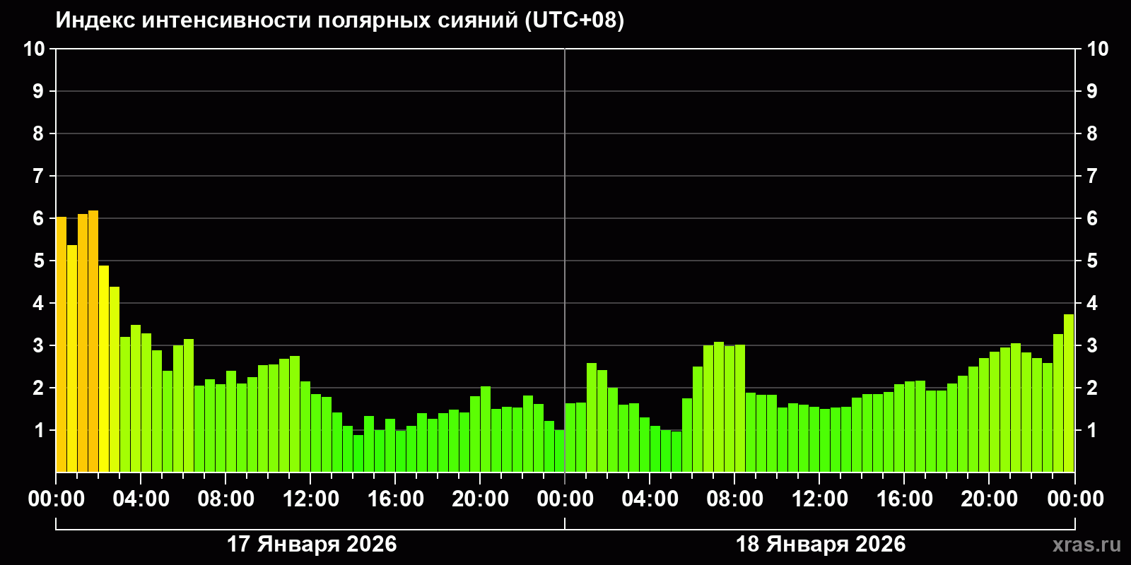 Изменения индекса интенсивности полярных сияний с 2026-01-17 по 2026-01-18 по местному времени