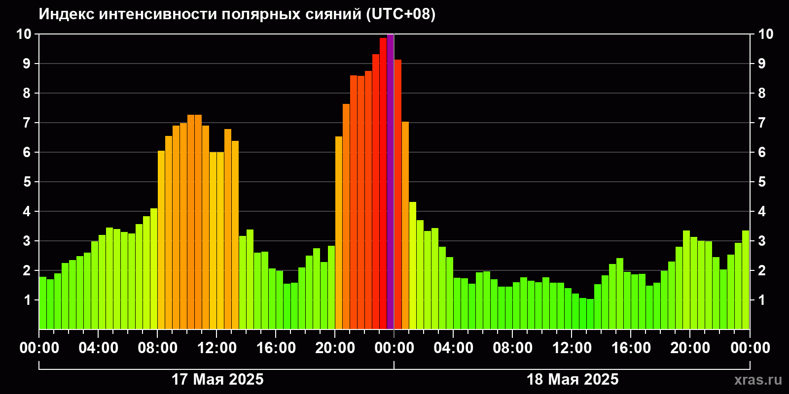 Изменения индекса интенсивности полярных сияний с 2025-05-17 по 2025-05-18 по местному времени