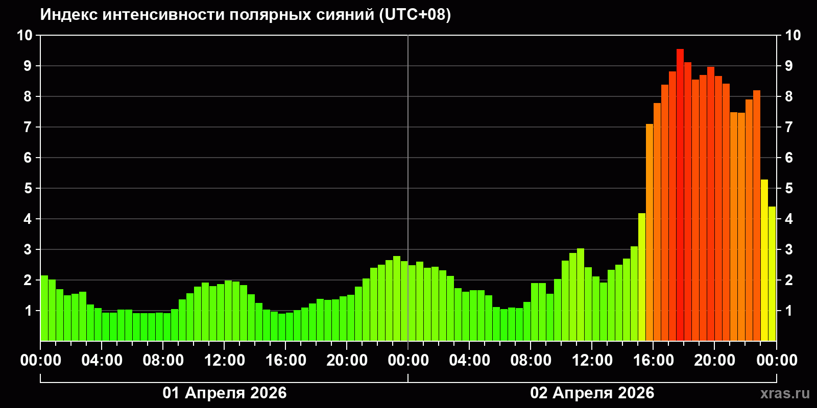 Изменения индекса интенсивности полярных сияний с 2026-04-01 по 2026-04-02 по местному времени
