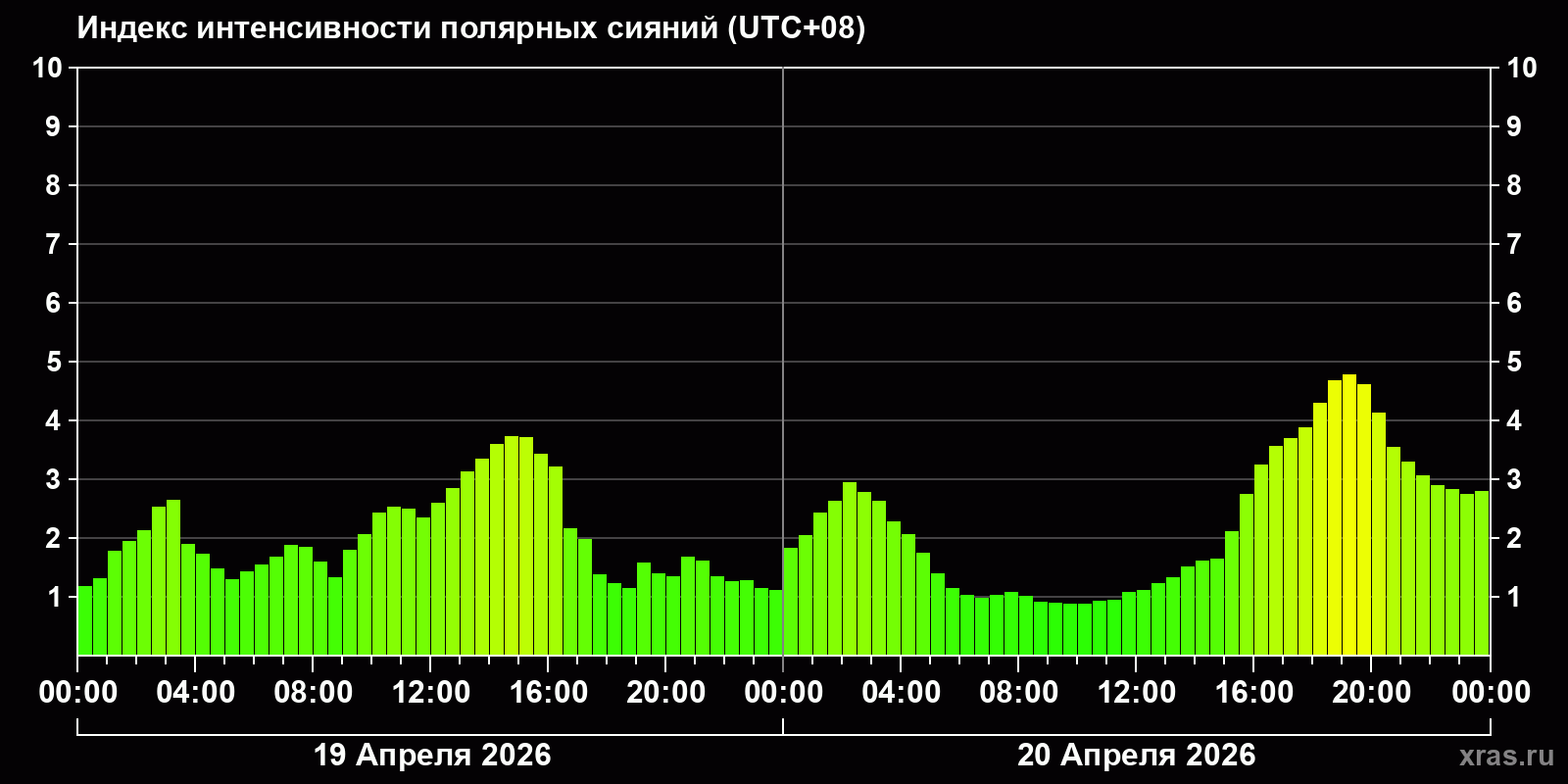 Изменения индекса интенсивности полярных сияний с 2026-04-19 по 2026-04-20 по местному времени