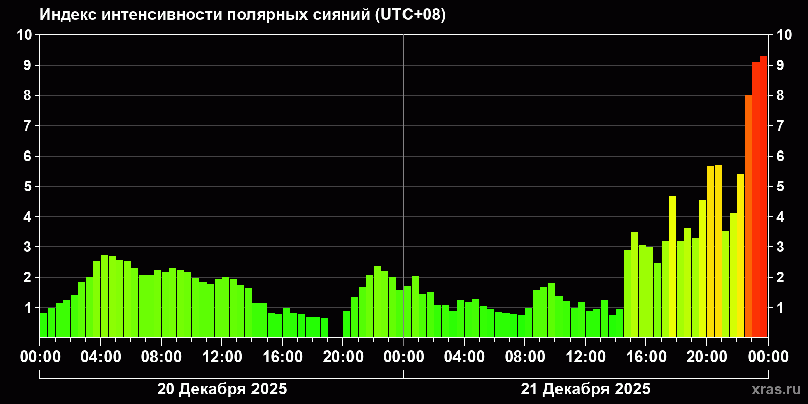 Изменения индекса интенсивности полярных сияний с 2025-12-20 по 2025-12-21 по местному времени