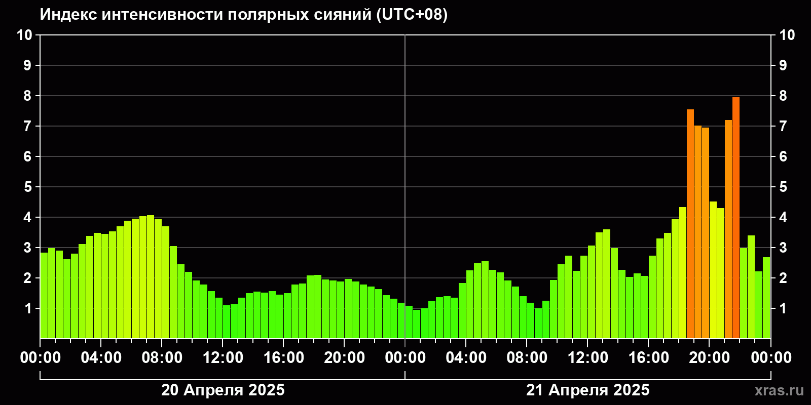 Изменения индекса интенсивности полярных сияний с 2025-04-20 по 2025-04-21 по местному времени
