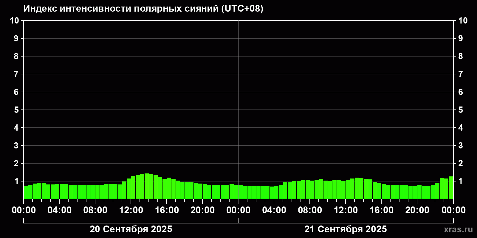 Изменения индекса интенсивности полярных сияний с 2025-09-20 по 2025-09-21 по местному времени