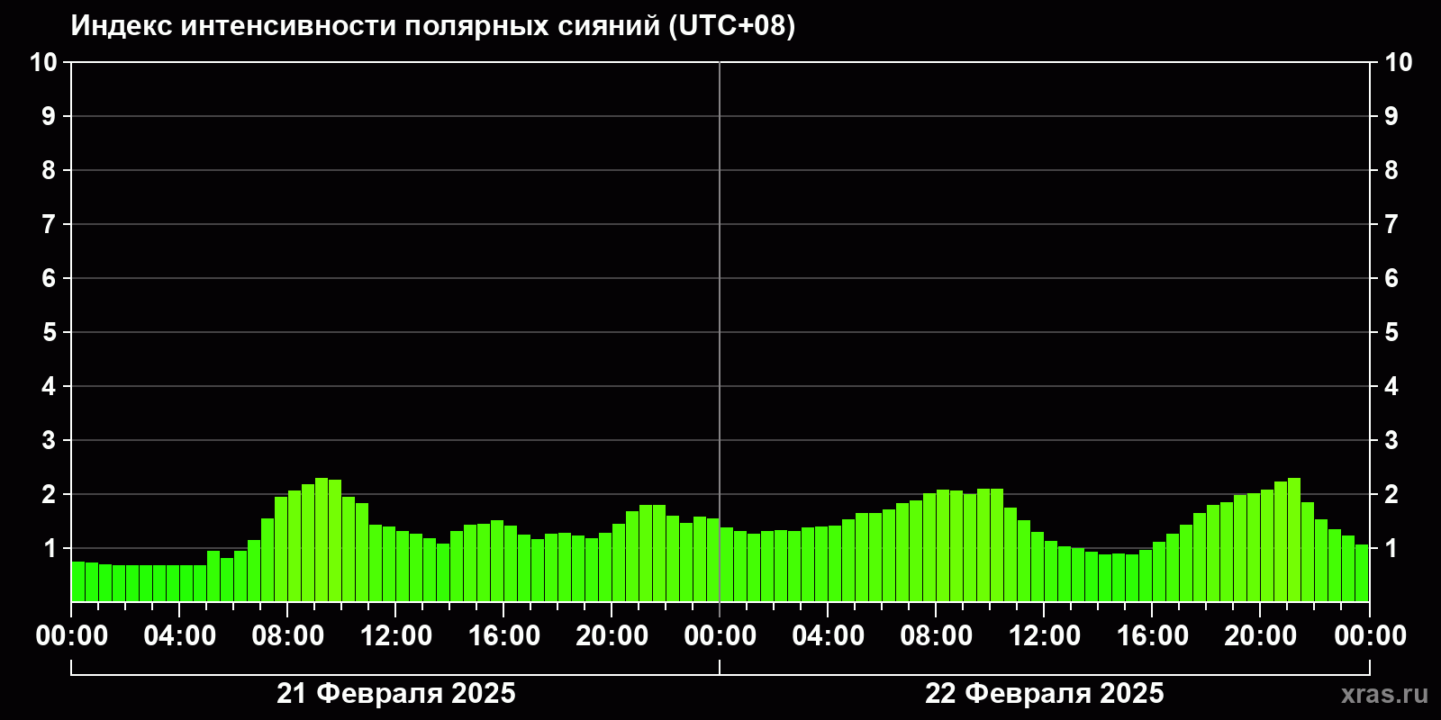 Изменения индекса интенсивности полярных сияний с 2025-02-21 по 2025-02-22 по местному времени