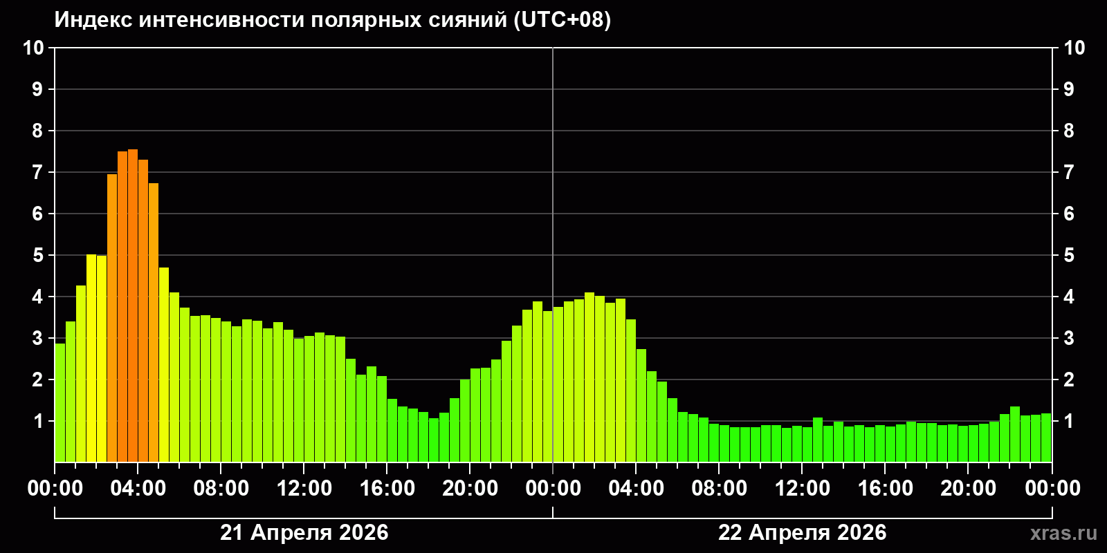 Изменения индекса интенсивности полярных сияний с 2026-04-21 по 2026-04-22 по местному времени
